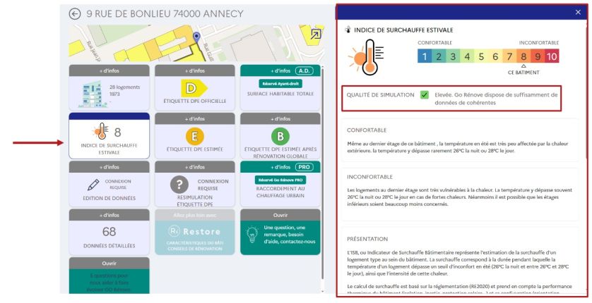 Les données d’un seul bâtiment sur le site Go Rénove. L’ISB peut être utilisé à l’échelle d’un seul bâtiment, mais aussi d’une commune, d’une collectivité, d’une région... Auquel cas les données statistiques de l’ensemble de la zone sélectionnées sont divulgués. © Capture d'écran webinaire CSTB