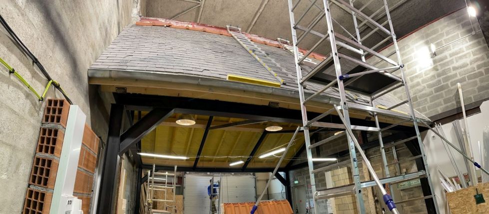 Les plateaux techniques de La Solive, à Paris, permettent aux élèves de s'entraîner en conditions réelles sur un toit incliné à 25° ou 45°, et situé à 5,5 mètres de hauteur. © La Solive
