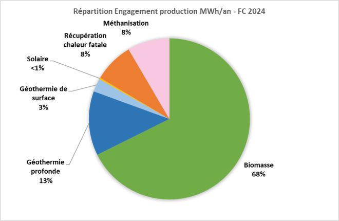 Suivent les chaufferies biomasse (328,2 M€), les installations géothermiques profondes et de surface (110,9 M€), les équipements de valorisation du biogaz par injection au réseau (20,8 M€), ceux pour la récupération de la chaleur fatale (13,4 M€) et le solaire thermique (9,4 M€). Le graphique ci-dessous illustre la contribution de chaque source à la production de chaleur R&R.
