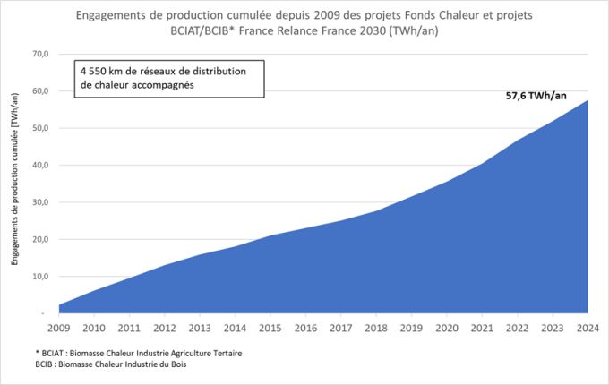 Les chiffres sont encore plus éloquents sur le long terme : toujours d'après l'Ademe, le Fonds chaleur a aidé quelque 10.000 installations d'ENR&R depuis 2009, dont 4.550 km de réseaux de distribution de chaleur bénéficiant de 5,1 milliards d'euros d'aides et ayant généré 16 milliards d'euros d'investissements.