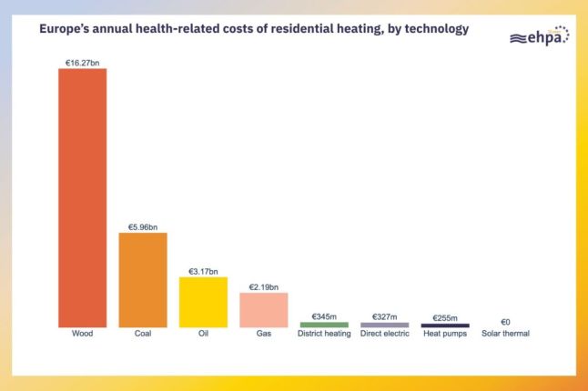 Coûts annuels du chauffage résidentiel liés à la santé en Europe, par technologie. Source : EHPA