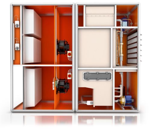 Dans une CTA adiabatique, on trouve deux échangeurs : l’échangeur classique alimenté en eau glacée ou connecté en expansion directe à un module extérieur, et un échangeur adiabatique. En cas de besoin de rafraîchissement, l’échangeur adiabatique se met en route en premier, puis sollicite l’appoint de l’échangeur classique lorsque la puissance froid adiabatique ne couvre plus les besoins et s’efface complètement lorsque les besoins de froid ne permettent plus son fonctionnement (demande d’une chute de température trop importante…).